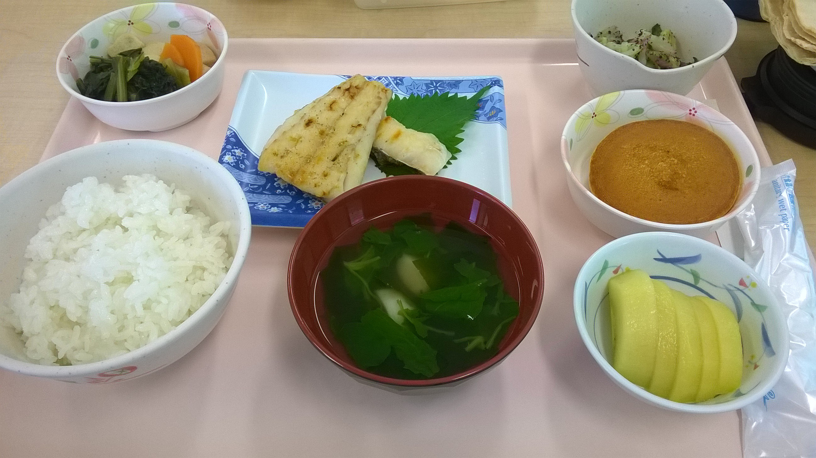 御飯、魚の味噌漬け焼き、青菜の煮浸し、フルーツ(オレンジ)、澄まし汁(花麩と若布)