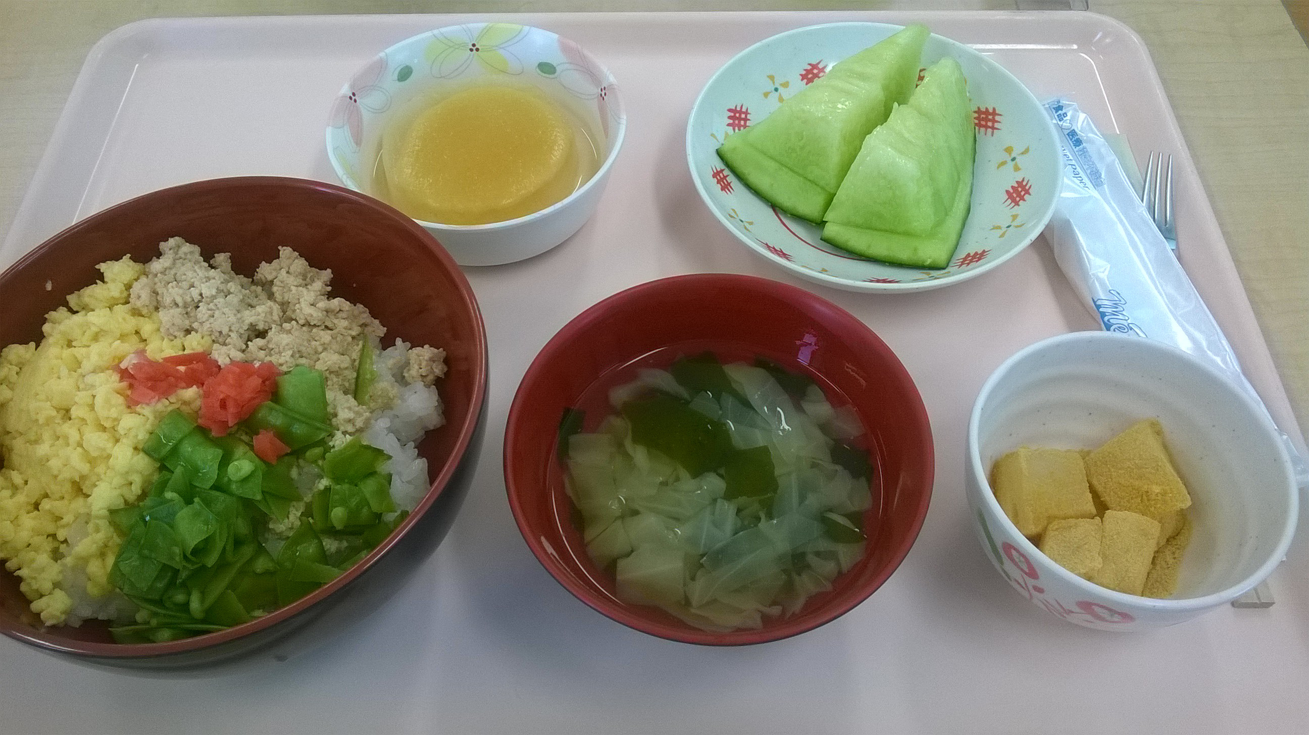 三色丼、ふろふき大根、澄まし汁(若布とキャベツ)、フルーツ(キウイ)